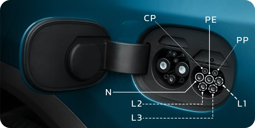 در شارژ AC از کانکتور Type 2 یا GB/T استفاده میشود. بررسی ظاهر و پینهای این کانکتورها میتواند اطلاعات مفیدی بدهد.